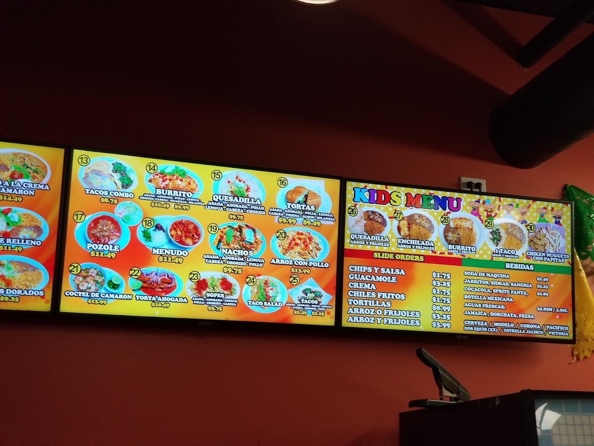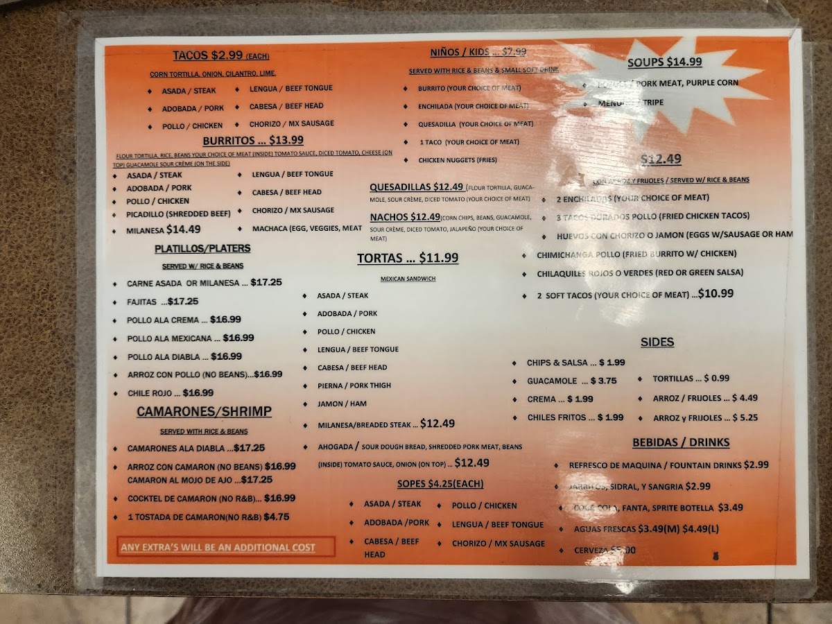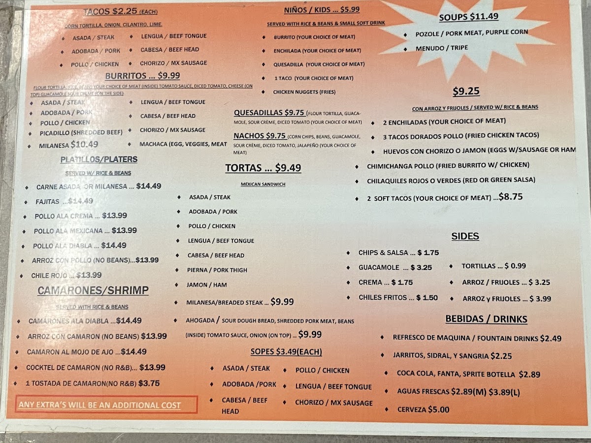 The menu provides a range of traditional Mexican food options ideal for quick service or casual sit-down meals throughout the day. Typical use involves ordering individual tacos, combination plates, or sides to create a customized meal experience.